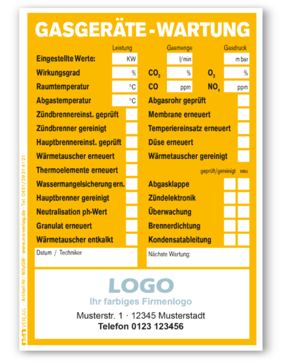 Ausführung wählen Dieses Produkt weist mehrere Varianten auf. Die Optionen können auf der Produktseite gewählt werdenDie Wartungsaufkleber des n&n Verlags dokumentieren zuverlässig die erbrachte Serviceleistung Ihres Fachbetriebs direkt am Gerät. Heizungs- und Lüftungsbau, Sanitärtechnik oder Haus- und Elektrotechnik: Unsere Etiketten sind auf die Anforderungen des Handwerks abgestimmt und sorgen für klare Nachweise und zufriedene Kunden.