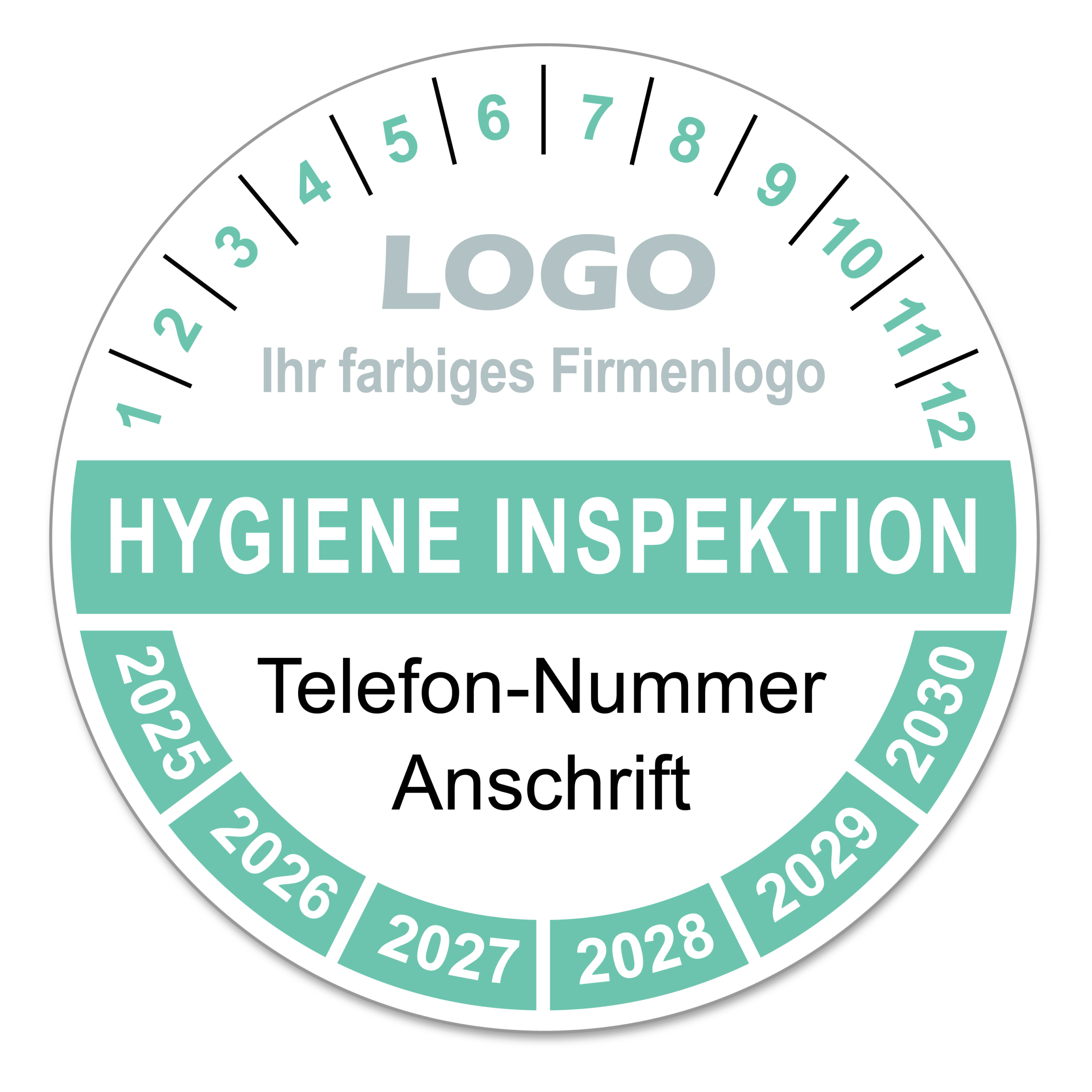 Prüfplakette mit dem Aufdruck „Hygiene Inspektion“, Durchmesser 24 mm, 40 mm oder 60 mm, PE-Folie, wasser- und UV-beständig, Leicht beschriftbar